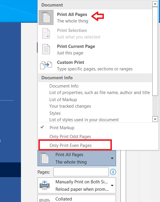 - Click on the ‘Print All Pages’ drop-down and choose ‘Only Print Even Pages’ option.