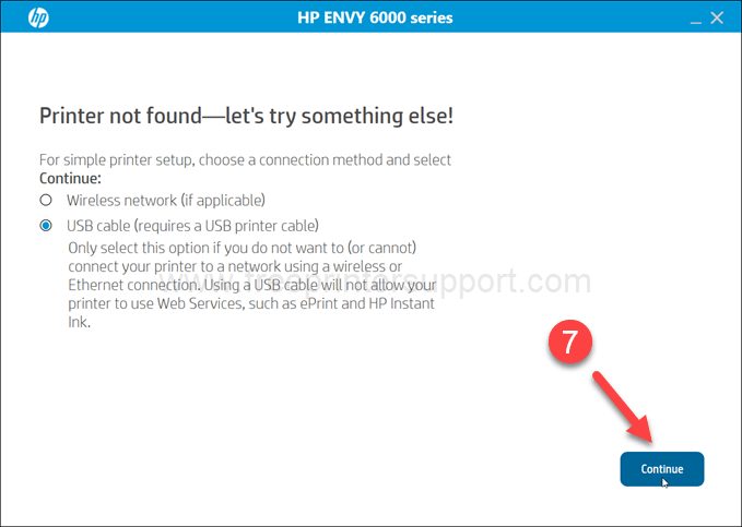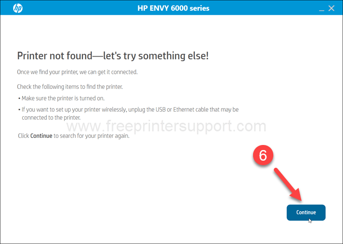 Step 6: It says printer not found. Click on continue to get more specific options to connect this printer to the computer.