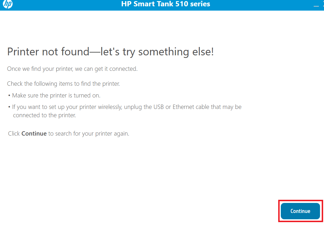 - Start your printer and connect with your computer via USB cable, then click on ‘Continue’. Once the setup program detects your printer, follow the prompts to complete the printer installation.
